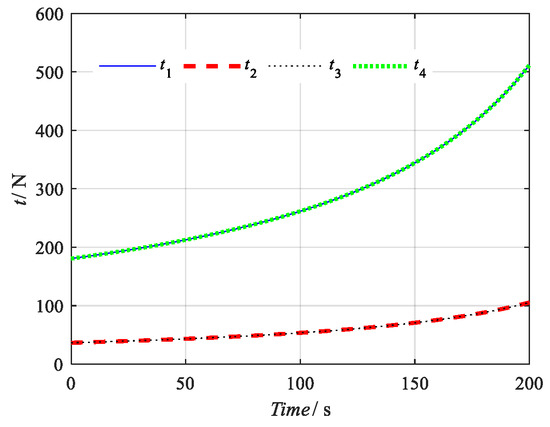 By Equation (8), the magnitude of the rope tension (i = 1, 2, 3, 4) at different times can be obtained, and the uniformity index S of rope tension distribution can be expressed as