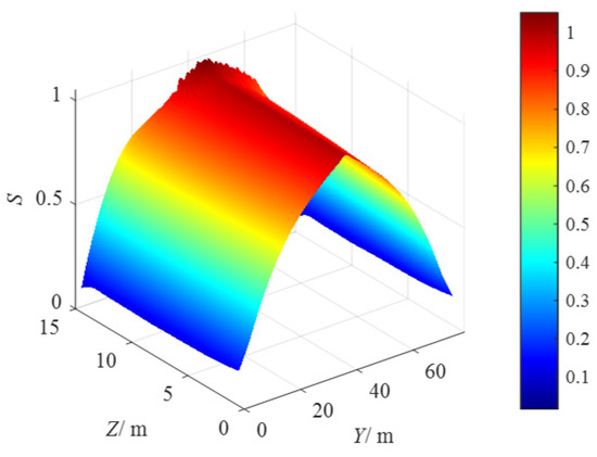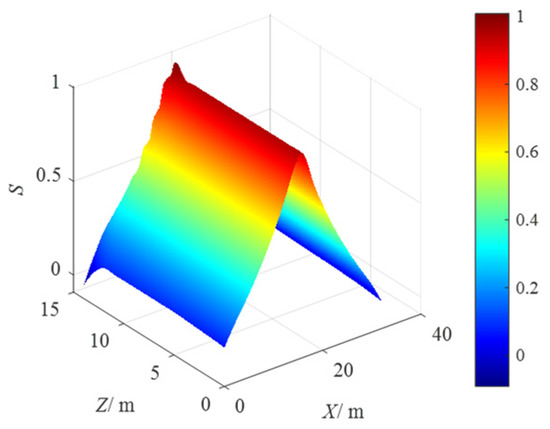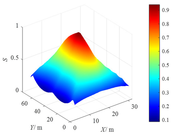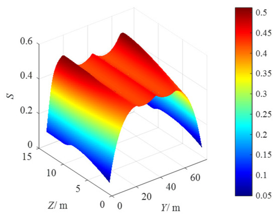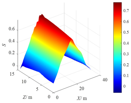 The distribution of S in the vertical section of Y = 40 m is shown in Figure 9, and the maximum value of S is Smax = 0.98. It can be seen from Figure 9 that the distribution of S in this section is symmetrical with respect to the plane of X = 17.5 m, and it increases first and then decreases with the increase in Y value. The distribution of S in the vertical section of Y = 60 m is shown in Figure 10, and the maximum value of S is Smax = 0.765. Similarly, the distribution of S is symmetrical with respect to the plane of X = 17.5 m, but the maximum value of S decreases significantly. Compared with Figure 9 and Figure 10, it can be seen that when the position of the damage detection platform moves from the center of the robot structure to the boundary, the S value decreases significantly; that is, the stability of the rope-driven bridge pier damage detection robot system is decreased.