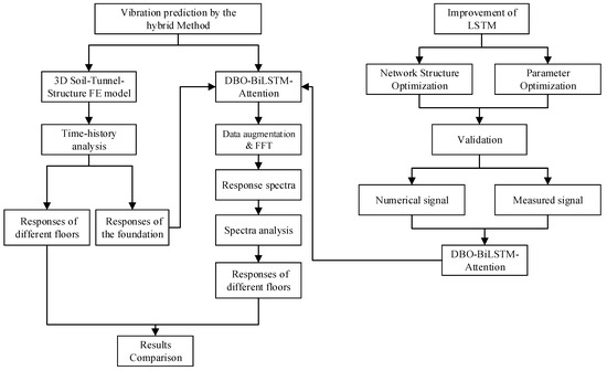 (1) The improved LSTM model is composed of BiLSTM, an attention mechanism, and the DBO algorithm, resulting in the development of the DBO–BiLSTM–attention network. This model is validated using both numerical simulation signals and measured signals. The results show a significant improvement in prediction accuracy compared to the standard LSTM network. For numerical simulation signals, values of RMSE and MAE decreased to varying degrees under different scenarios, while the value of R2 increased by at least 3% while maintaining a high level. For the measured data of subway-induced vibration, RMSE decreased by 67.2%, MAE decreased by 67.9%, and R2 increased by 49.37%.
