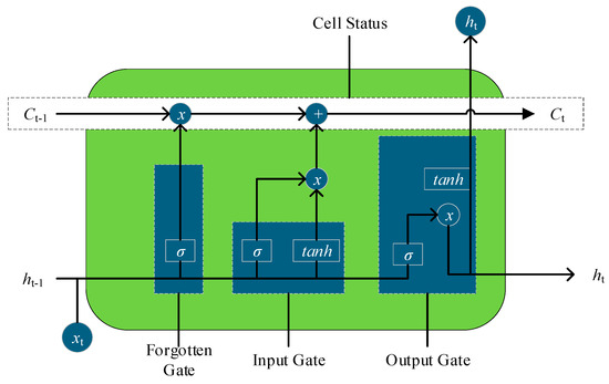 The LSTM model is an extension of the traditional RNN designed to overcome this problem. The key innovation in LSTMs is the memory cell, which serves as a long-term storage unit that can preserve information over extended periods of time. This cell is controlled by three gating mechanisms: the forget gate, the input gate, and the output gate. These gates allow the LSTM to selectively retain or forget information at each time step, addressing the limitations of standard RNNs [29]. The basic structure of LSTM is shown in Figure 2.