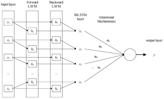 The attention layer is integrated on top of the BiLSTM network, forming the BiLSTM–attention model. This structure enhances the network’s ability to assign different levels of importance to input elements, enabling more accurate predictions [30]. The structure of the BiLSTM–attention network is illustrated in Figure 5.