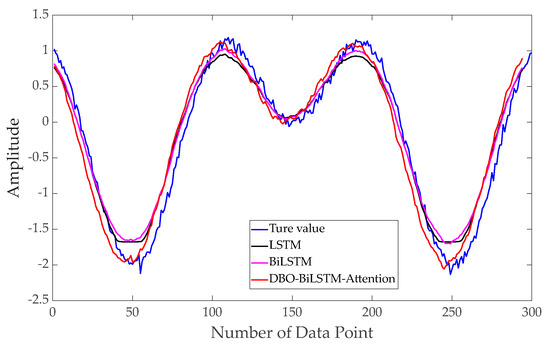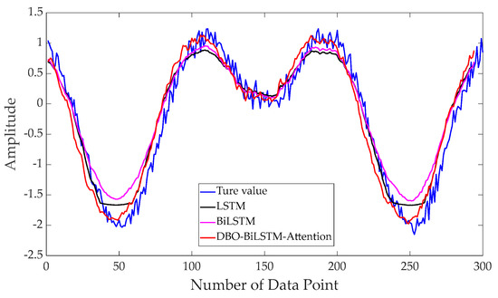 The model parameters were chosen with a training-to-testing dataset ratio of 0.7, a sliding window of 10, one-step prediction, 1000 training iterations, 128 hidden layer neurons, and one fully connected layer. The optimizer used was Adam. LSTM, BiLSTM, and DBO–BiLSTM–attention models were used for data prediction. The prediction results under four different operating conditions are shown in Figure 6, Figure 7, Figure 8 and Figure 9. The prediction results from different models are very close. However, noticeable differences emerge in the local rising segments. The prediction results from the DBO–BiLSTM–attention network are closer to the original signal trend compared to the other models.