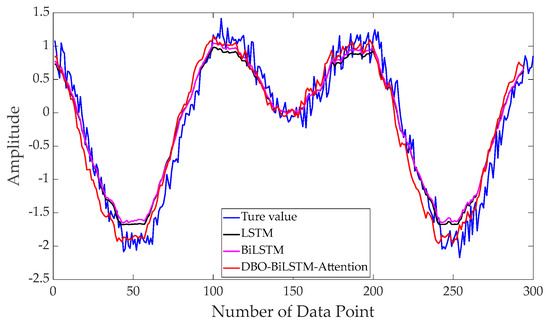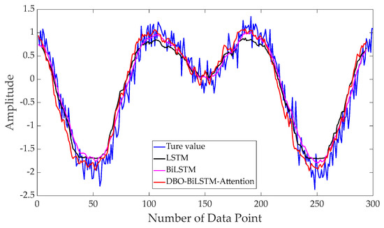 The evaluation metric values of different models under different noise levels are shown in Table 1. As the noise level increases, the prediction errors of all models increase as well, but the DBO–BiLSTM–attention model still maintains the highest accuracy. Especially in scenario 4, the RMSE of the DBO–BiLSTM–attention network decreased by 13.1% compared to the original LSTM network, the MAE decreased by 12.7%, and the R2 improved by 3.20%.