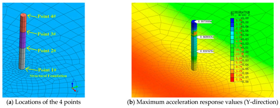 A point selected at the structural foundation is labeled as Point 1#. Additional points are chosen at the heights of 4 m, 7 m, and 10 m in the structure, and are labeled as Points 2#, 3#, and 4#, respectively. The locations and maximum acceleration response values of the four points are shown in Figure 17.
