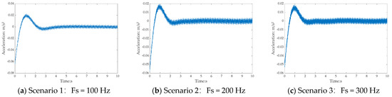 By the time-history analysis, the dynamic responses of the structure at Points 1# to 4# under different sampling frequencies are obtained. This study focuses exclusively on the acceleration response in the Y-direction. Due to space limitations, only the time-history of the acceleration response at Point 1# (structural foundation) is presented. The Y-direction acceleration responses at Point 1# are shown in Figure 18, used as the input for the spectral analysis in the next section. Point 1#, situated at the structural foundation, exhibits notable fluctuations in the first half of the graph, primarily attributed to instantaneous vibrations induced by load activation. Over time, the acceleration at Point 1# gradually stabilizes and exhibits regular oscillations.
