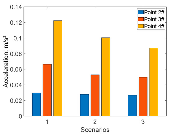 Figure 19 illustrates the maximum acceleration values of different floors (Points 2# to 4#). Notably, the maximum acceleration values at Points 2 to 4 remain relatively consistent across the three scenarios. However, due to the combined effects of factors such as mass distribution and the structure’s vibration modes, the acceleration values at Points 2# to 4# exhibit a distinct pattern, increasing progressively with height.