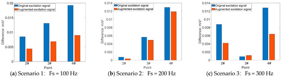 Using the maximum acceleration response values derived from the time-history analysis in Section 4.2.2 as a baseline, Table 6 presents a comparison between the results obtained using the original excitation signal and those derived from the augmented excitation signal. The frequency difference between the results obtained from two types of input data and the baseline is shown in Figure 23. It can be observed that the errors in both cases are nearly identical, and overall, the error decreases as the number of sample points increases. This indicates that increasing the number of sample points for data augmentation effectively reduces the error. The maximum prediction error occurs in scenario 1 of Point 4#. The maximum difference between “baseline” and “original” is 0.015 m/s2. The maximum difference between “baseline” and “augmented” is 0.009 m/s2. Applying the proposed hybrid method for data augmentation enhances the accuracy of the spectral analysis. The hybrid method proposed achieves an improvement of 7% for the prediction accuracy.