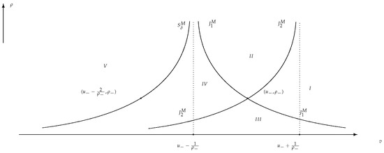 Similar to Section 6.1, it is easy to obtain the variation in the fundamental wave curve when . Here, there is not only the generation of shock waves, but also the emergence of vacuum phenomena.