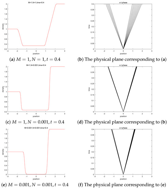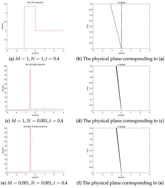 According to the conditions in Sections and, given the negative and positive states, such that and , when , , from Figure 5a, the density of the intermediate state has not changed much relative to the initial value, and from Figure 5b, it can be found that the solution is composed of two shock waves. However, for the same initial value, when taking , , from Figure 5c, the density of the intermediate state has changed significantly compared to Figure 5a. From Figure 5a,c, the density of the intermediate state becomes larger and the mass concentration phenomenon occurs as the magnetic induction intensity tends towards zero. Moreover, from Figure 5b,d, it can be observed that two shock wave solutions converge together and, due to the phenomenon of mass concentration, it can be concluded that a shock wave has occurred. Similarly, from the comparison between Figure 5a,e, the occurrence of mass concentration phenomenon can also be observed.