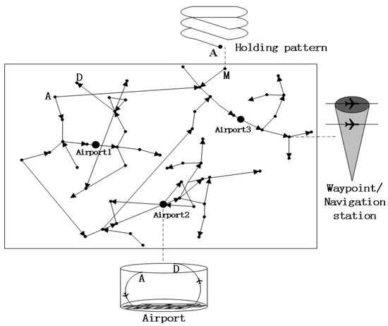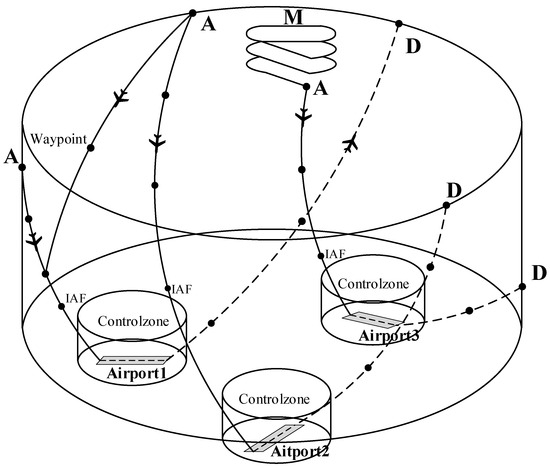 A terminal area is a control area [12] located at the confluence of air traffic service airways near two or more airports. As shown in Figure 1, the terminal area contains three airports. A is the approach point, D is the departure point, and the remaining points are waypoints, important navigation stations, and instrument approach fixes (IAFs). M is the holding pattern. The solid lines in the figure indicate the approach routes for aircraft, and the dashed lines indicate the departure routes.