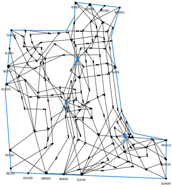In this paper, we used the airspace structure and operation of Beijing’s terminal area (including the three airports ZBAA, ZBAD, and ZBTJ) as an example for empirical analysis. A traffic network model of the terminal area is constructed using Python, as shown in the Figure 4. The blue nodes are airports, the terminal area edge nodes are arrival and departure points, and the remaining nodes are waypoints or navigation stations. The connecting edges are the approximate historical flight paths of each aircraft under radar control.