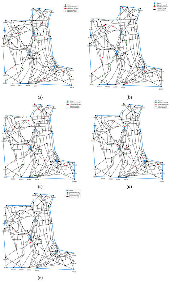 Since aircraft move an average of about 8–18 km every 2 min, changes in congestion can also be better represented. Therefore, every 10 min is used as a time period, and every 2 min is used as a unit of time. The number and spacing of aircraft on each edge at each moment are counted. Due to limited accuracy, the aircraft closest to the connecting line within 1 km are counted as aircraft on that connecting line. The position of aircraft from 13:00 to 13:10 on a certain day is shown in Figure 5. Approaching aircraft are colored green, and departing aircraft are colored red. The position of aircraft at 13:00 to 13:10 on a certain day is shown in the figure. Figure 5a–e show the position of aircraft at 13:00, 13:02, 13:04, 13:06, and 13:08, respectively.