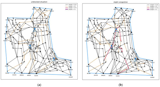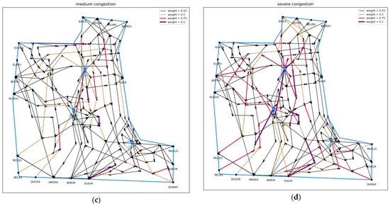 After that, the busyness of the link is calculated according to the method in Section 2.2.2 and converted into an edge weight. For comparison purposes, the density is also multiplied by 1000. Since the spacing between the noses of the aircraft in the Beijing terminal area is more than 5.6 km and is combined with the definition of the traffic congestion situation identification index in Section 3, the value of parameter , where there is only one aircraft on the link, is set to a larger 10. Since the number of aircraft on the edge and the distance between aircraft have the same impact on the busyness of the edge, the value of is set to 1. Combining expert opinions with the actual situation in Beijing’s terminal area, the weight of edges with busyness B within 0 and 0.1 (inclusive) is 25%, the weight of edges with B within 0.1 and 0.2 (inclusive) is set to 50%, the weight of edges with B within 0.2 and 0.3 (inclusive) is set to 75%, and the weight of edges with B at 0.3 and above is set to 100%. If no aircraft passes over the edge during that period, the edge weight is set to 0. Some of the calculated data segments are shown in Table 1.