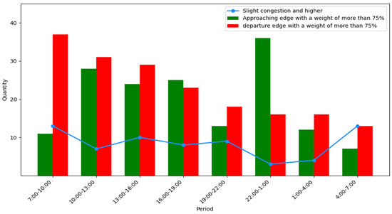 Statistics: the number of time periods with an air traffic congestion situation in the terminal area that is above “slight congestion” throughout the day on November 3, as well as the number of arrival and departure edges with a weight of more than 75%, are shown in Figure 7. As can be seen, the terminal area was more congested between 7:00 and 10:00, and the congestion was mainly affected by departing aircraft. The air traffic congestion situation in the terminal area from 10:00 to 13:00, 13:00 to 16:00, and 16:00 to 19:00 was also relatively high, but it was more evenly affected by the arrival and departure of aircraft. The air traffic congestion situation in the terminal area from 22:00 to 1:00 was slightly higher, and the congestion situation was mainly affected by the aircraft approaching. The congestion levels at other times of the day were relatively low. Overall, the identification results were more in line with the actual situation.