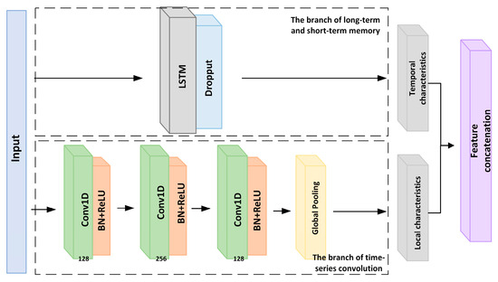The MLSTM-FCN [37] model is composed of two branches, namely, the temporal convolution branch and the long short-term memory branch, as depicted in Figure 1. The temporal convolution branch adopts a fully convolutional network (FCN) architecture, which comprises three convolutional blocks. Each convolutional block encompasses a one-dimensional convolutional layer, BN, and the ReLU() activation function, with the numbers of filters being 128, 256, and 128, and the kernel sizes being 8, 5, and 3, respectively. Behind each convolutional layer is the batch normalization, and following the last temporal convolutional block is the global average pooling layer. The global average pooling layer can substantially reduce the network parameters in classification networks and concurrently alleviate the emergence of overfitting issues.
