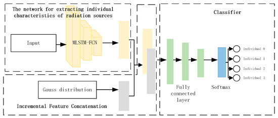 Compared with other radiation sources, the manual cost of collecting and annotating samples for communication radiation sources is relatively high. In the actual collection environment, influenced by factors such as electromagnetic interference and adverse weather, certain types of communication radiation sources have short usage durations and high concealment, making them hard to collect and annotate. The abovementioned reasons result in a class imbalance in the individual signal dataset of communication radiation sources, that is, there is a significant disparity in the number of training samples among different classes in the dataset, and the recognition accuracy of the classes with fewer samples cannot be guaranteed. In light of the aforementioned issues, an incremental random feature concatenation approach based on MLSTM-FCN is put forward. The core concept of this method lies in addressing the issue of class imbalance in feature extraction through data augmentation means, thereby enhancing the recognition precision of classes with a smaller number of samples. The overall network framework of the proposed method encompasses three components: the individual feature extraction network section of the radiation source, the incremental feature concatenation section, and the classifier section. The overall framework of the individual recognition method in the case of class imbalance is depicted in Figure 2, and the process of the individual recognition method based on MLSTM-FCN incremental feature concatenation is presented in Algorithm 1.