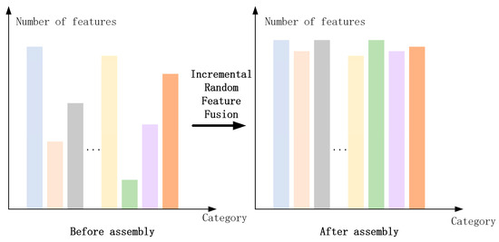 Firstly, random feature vectors are generated by zero-centered Gaussian distribution in the feature space, and the dimension of the randomly generated feature vectors remains consistent with the feature dimension extracted by inputting the training sample set into the MLSTM-FCN feature extractor. Subsequently, labels belonging to the minority classes are assigned to the generated random vectors, and the features of the same dimension are concatenated. Finally, the concatenated feature vectors are utilized to complete the training of the subsequent network model. After the incremental feature concatenation, the model can better leverage the effective label data for learning, extract more reliable and distinguishable features, and enhance the recognition effect of the small-sample categories. A comparison diagram of the number of features among various categories before and after the incremental random feature concatenation is presented in Figure 3 as follows.