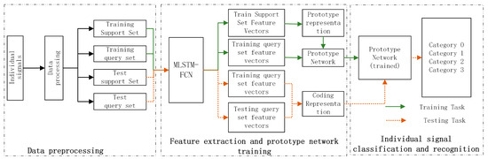 To address the issues of low recognition accuracy and poor model generalization in the context of small samples, a communication radiation source individual recognition method based on meta-learning is proposed. The MLSTM-FCN model was selected as the prototype network, and the individual features of each category of communication radiation source were learned to form a prototype representation. The training strategy of meta-learning made the prototype distribution among individual features more distinct. Based on the classification rule of prototype distance, individual samples were classified and identified, which mitigated the overfitting problem brought by small samples and enhanced the individual recognition effect of communication radiation sources in small-sample scenarios. The procedure of the individual identification method for communication radiation sources based on meta-learning mainly consists of three parts: data preprocessing, feature extraction, and prototype network training and individual classification and recognition. The overall process of the proposed method is presented in Figure 4.