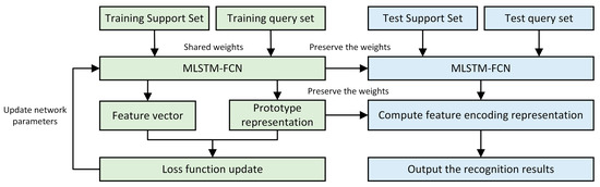The training of the prototype network encompasses two processes. First, the prototype representation of each individual class of communication radiation sources is computed, and then the MLSTM-FCN model is trained to calculate the feature encoding representation of the individual to be classified. The specific procedure of prototype learning is depicted in the training steps in Figure 5.
