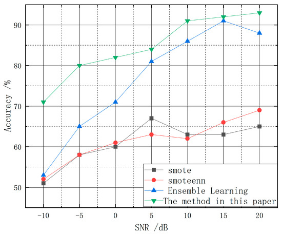 In the task of signal recognition, the signal-to-noise ratio (SNR) can exert a certain influence on the recognition accuracy. Regarding the method proposed in this chapter, comparative experiments were carried out with commonly employed class imbalance recognition methods such as the SMOTE method, the SMOTEENN method, which combines SMOTE and ENN, and the ensemble learning method under different SNR circumstances.
