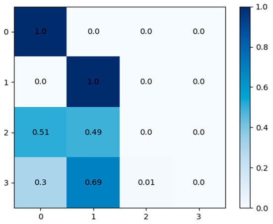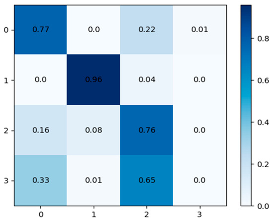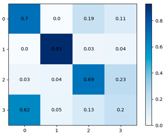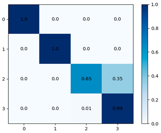 Judging from the accuracy rates of the comparative experiments (Figure 6) and the confusion matrices (Figure 7, Figure 8, Figure 9 and Figure 10), the proposed individual identification method of concatenating the features of communication radiation sources by randomly generating feature vectors performs better and has higher recognition accuracy compared to other class-imbalanced recognition methods. Under the circumstance where the signal-to-noise ratio is −10 dB, the recognition accuracy of the method proposed in this paper is enhanced by more than 15% compared with the other three methods. When the signal-to-noise ratio is greater than 10 dB, even under the condition of class imbalance, the recognition accuracy always exceeds 90%. Compared with the ensemble learning method, the average recognition accuracy of the method proposed in this paper is 4.2% higher. Simultaneously, in the case of low signal-to-noise ratio, the recognition effect far exceeds that of other class-imbalanced algorithms, verifying the validity and feasibility of the proposed method and providing a new perspective for classification and recognition tasks under class-imbalanced circumstances.