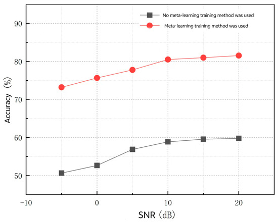 Based on the comparison results in Figure 11, it can be observed that the accuracy of model recognition after meta-learning training is significantly higher than that of the conventionally trained model under various signal-to-noise ratios. At a signal-to-noise ratio of 20 dB, the recognition accuracy is enhanced by more than 20%.