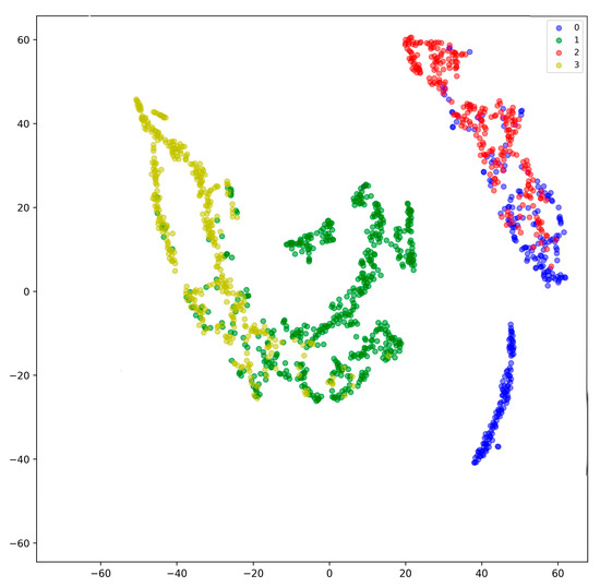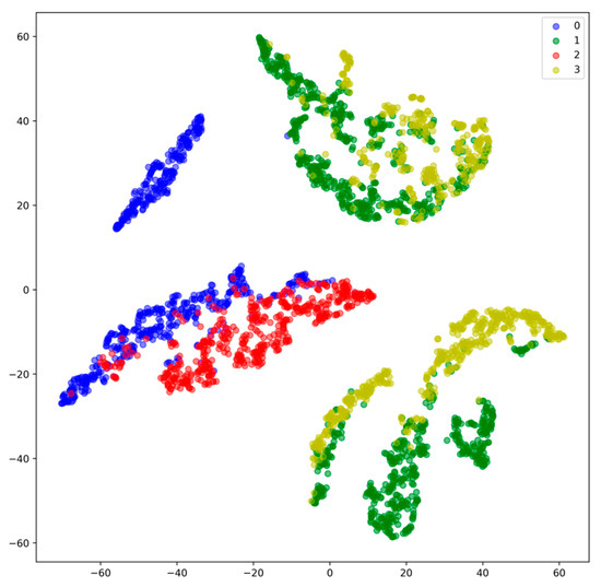 The prototype network utilizes distance to measure the similarity between the sample encoding representation and the existing prototype representation for classification and identification. To present the impact of meta-learning training on feature extraction more intuitively, the extracted features are visualized. Figure 12 and Figure 13 depict the schematic diagrams of the feature distributions after the dimensionality reduction of individuals trained by the conventional and meta-learning strategies, respectively. When comparing Figure 12 and Figure 13, it can be observed that the feature distribution boundaries extracted by the model trained with the meta-learning strategy are more distinct than those of the conventionally trained model. On this basis, the effect of classification and identification using the prototype distance is better.