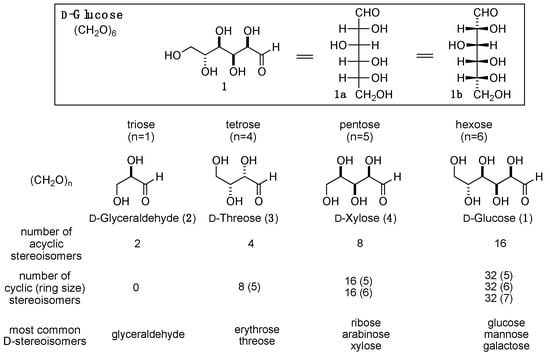 Of the building blocks that form biopolymers, carbohydrates possess the greatest degree of stereochemical complexity. For example, the hexose d-glucose 1, the most common six-carbon carbohydrate, has four chiral centers in its acyclic form and five in its cyclic forms. In their simplest forms, carbohydrates are compositionally defined by the molecular formula (CH2O)n, where n is the number of carbon atoms in the chain. When the carbon count reaches three (triose), the simplest chiral carbohydrate, glyceraldehyde 2, is formed, with a single chiral center at the C-2 position. Glyceraldehyde can exist in a d- or l-configuration, where the d-glyceraldehyde has R-configured alcohol at C-2 and the l-glyceraldehyde is S-configured at C-2. This simple choice of d- vs. l-sugars fundamentally establishes the chiral bias of carbohydrates in nature. In four-carbon sugars (tetroses), a second stereocenter arises, resulting in four possible acyclic stereoisomers (22) and eight cyclic, five-membered ring (furanose) isomers (23). Five-carbon sugars (pentoses), having three chiral centers, yield eight acyclic stereoisomers (23). Additionally, they form two sets of sixteen cyclic isomers (24), consisting of furanoses and pyranoses (six-membered rings). Finally, hexose sugars, with four stereocenters, yield sixteen acyclic stereoisomers (24) and three sets of thirty-two cyclic isomers (25), including furanose, pyranose, and septanose (seven-membered ring) forms (Scheme 2).
