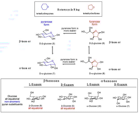 The hydroxy-aldehyde functionality of the hexoses can reversibly form cyclic structures, primarily five- and six-membered rings with a hemiacetal functionality at the C-1 position (Scheme 2). In the case of the furanose and pyranose rings, the equilibrium constant lies heavily in favor of the cyclic structures. In the cyclic form, the C-1 group is called the anomeric position, which is the point of attachment for the glycosidic bond. When in a chair conformation, the newly formed hemiacetal introduces a hydroxyl group and a new chiral center at the anomeric position. When the hydrogen of the anomeric hydroxyl group (OH) is replaced with an alkyl-group (OR), the newly formed acetal product is called an alkyl-glycoside. The anomeric group can have a configuration that is either trans (alpha (α)-stereochemistry) or cis (beta (β)-stereochemistry) relative to the C-6 substituent. There is a balance between countervailing steric and electronic effects that favor the α- and β-stereoisomers. While the equatorial β-isomer is sterically preferred, the axial α-isomer is electronically preferred. This electronic preference, called anomeric effect, arises from the antiperiplanar arrangement, where hyperconjugation provides electronic stabilization to the α-isomer.