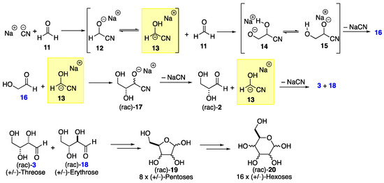 The mechanism of chain propagation in the formose synthesis begins with the cyanide attack on formaldehyde 11 to form oxyanion 12, which equilibrates to carbanion 13. The insight gained from the understanding of this mechanism underlying this equilibrium process was fundamental in the development of many related Stetter-type processes and our understanding of thiamine biochemistry [13,14,15]. The nucleophilic carbanion 13 can be added to another molecule of formaldehyde 11 to form alkoxide 14, which can equilibrate further to alkoxide 15. Because of the proximity of the alkoxide anion in 15 to the cyano group, 15 can eliminate an equivalent of sodium cyanide, forming the simplest of the sugars, glycolaldehyde 16. Under the same reaction conditions, the aldehyde in 16 can further react with 13 via an analogous addition and proton migration to form 17, which can similarly eliminate cyanide to form glyceraldehyde 2 as a racemic mixture. After another round of addition/isomerization/elimination between rac-glyceraldehyde 2 and 13, a mixture of the racemic cis-triol threose 3 and trans-triol erythrose 18 is produced. Further extension by one or two carbons (via carbanion 13) leads to eight possible pentose diastereomers 19 or 16 possible hexose diastereomers 20, both as racemates. A full appreciation of the extent of the product mixture formed, including stereochemical diversity and chain lengths, only became possible with the development of modern analytical methods, although it should be noted that this work inspired the synthetically practical stepwise approach of Dondoni [16].