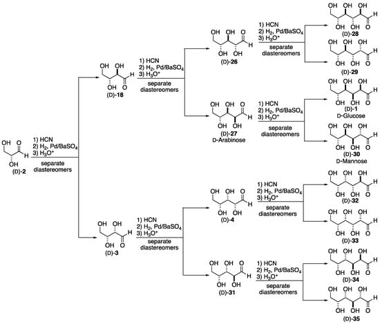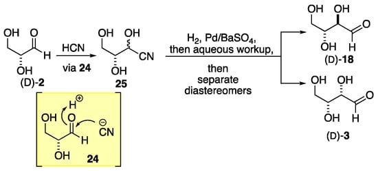 The basic three-step process developed by Fischer is outlined in Scheme 5. This process involved cyanohydrin formation, reduction/hydrolysis, and separation. The process began with the addition of HCN to d- or l-glyceraldehyde 2 with the addition to the d-enantiomer shown. The nucleophilic addition of cyanide to either face of the aldehyde in glyceraldehyde (d)-2 (via 24) affords triol 25 as a diastereomeric mixture. The carbon/nitrogen triple bond in nitrile 25 was reduced to form a diastereomeric mixture of aldehydes. At this point, the two aldehydes, (d)-3 and (d)-18, can be separated into optically pure forms. Importantly, the optical purity of (d)-3 and (d)-18 is determined by the configuration of the starting d-glyceraldehyde (d)-2. Thus, if L-glyceraldehyde (l)-2 was used as the starting material, the products would be l-erythrose (l)-18 and l-threose (l)-3. Conversely, using racemic glyceraldehyde (rac)-2 would yield racemic erythrose (rac)-18 and threose (rac)-3.
