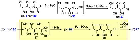 In practice, the essentially optically pure form of d- (or l-) glyceraldehyde 2 was obtained from readily available, naturally sourced hexoses via a retro version of the Fischer methodology. This was accomplished using the Ruff degradation reaction (Scheme 7) to dismantle the carbohydrate one carbon at a time, from the reducing end of the sugar. The two-step oxidative degradation begins with an oxidation of the aldehyde to a carboxylic acid via intermediate 37, followed by an oxidative decarboxylation of the hydroxy acid via intermediate 38 to yield a shortened sugar with a C-1 (formerly C-2) aldehyde. Thus, Ruff degradation can produce pentose sugars from a hexose. For example, either glucose 1 or mannose 30 could be converted into arabinose 27 through the intermediate carboxylic acid 36. Two further rounds of this chain length reduction would produce d-glyceraldehyde (d-2) from any d-hexose, or l-glyceraldehyde (l-2) from any L-hexose. Importantly, the resulting pentose sugar is produced as a single diastereomer, where the C-3 to C-5 stereochemistry of the hexose starting material matches the C-2 to C-4 stereochemistry of the pentose product. The high stereospecificity of both the cyanohydrin formation and the Ruff degradation were key factors in enabling Fischer to assign the stereochemistry of all the hexoses.