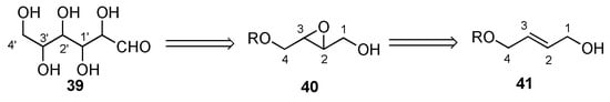 Since the seminal work of Fischer, synthetic chemists have used the structures of carbohydrates as inspiration for the development of new asymmetric methods for the synthesis carbohydrate motifs. Of particular interest are those routes to sugars that start from achiral starting materials, where asymmetric catalysis is used to install the initial asymmetry (i.e., d- or l-sugar). These asymmetric routes, starting from achiral materials, are referred to as “de novo” or “de novo asymmetric” routes. It should be noted that in the carbohydrate synthesis community the term de novo has taken on very different meanings. The de novo asymmetric synthesis of the hexoses has been an important and ongoing interest to the synthetic community. Of these approaches, only the iterative epoxidation strategy of Masamune and Sharpless provides access to all eight hexoses. Their work utilized iterative asymmetric epoxidation of allylic alcohols to obtain the eight possible L-hexoses [17,18].