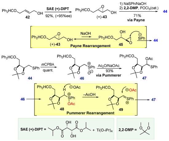 The Masamune–Sharpless approach involves the ability to add to hydroxyl groups across the trans-alkene of an allylic alcohol from either face in a net syn- or net anti-selective manner. In addition to the Sharpless epoxidation (42 to 43), the route developed by Masamune and Sharpless inventively involves the use of a Payne rearrangement (43 to 45), Pummerer reaction (44 to 47), and acetonide equilibration (50 to 51). The use of these reactions is outlined in Scheme 9 and Scheme 10.
