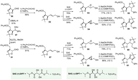 With two stereocenters established in 47, stereochemical divergence was possible based on the different hydrolysis conditions used. When DIBAL-H was used to hydrolyze 47, it produced aldehyde 50 in 91% yield without epimerization. Alternatively, when 57 was treated with K2CO3/MeOH, hydrolysis occurred in tandem with the desired base catalyzed epimerization at the adjacent stereocenter to form 51. A Wittig reaction was applied to both 50 and 51 to extend each molecule by two carbons, followed by NaBH4 reduction to afford terminal alcohols 52 and 57, respectively. Asymmetric epoxidation using either the (+)-DIPT or (–)-DIPT was applied to 52 and 57 to generate four new diastereomeric epoxides—53, 54, 58, and 59 in 76%, 84%, 71%, and 73%, respectively. These epoxides were subjected to the NaSPH/Payne rearrangement, once again, to induce regioselective epoxide opening and hydrolysis. After acetonide formation, the protected tetraols 55, 56, 60, and 61 were produced in 77%, 63%, 79%, and 86% yields, respectively (Scheme 10).