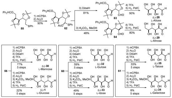 Each of the four acetonides (55, 56, 60, and 61) could be converted into two l-sugars through three steps: oxidation, Pummerer rearrangement, and hydrolysis (with or without epimerization). For example, 55 was oxidized and rearranged to afford 62 in 90% yield. Then, 62 was hydrolyzed, with or without epimerization, to afford aldehydes 64 and 63, respectively. Finally, these two protected l-sugars were acetonide deprotected, followed by hydrogenation to liberate the terminal alcohol, to afford l-allose (l)-28 and l-altrose (l)-29 in good yields. Correspondingly, l-mannose (l)-30 and l-glucose (l)-1 were produced from 56 in 77% and 22% yields, respectively. l-Gulose (l)-32 and l-idose (l)-33 were produced from 60 in 59% and 49% yields, respectively. Lastly, l-talose (l)-35 and l-galactose (l)-34 were produced from 61 in 33% and 8% yields, respectively (Scheme 11).