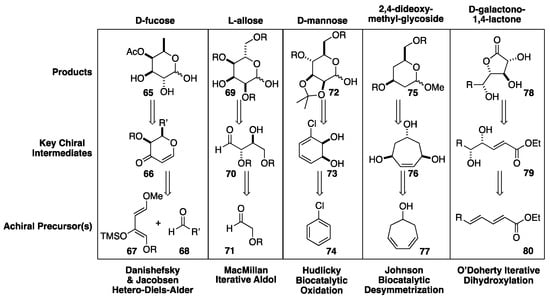 In terms of synthetic efficiency, the Masamune–Sharpless approach to the hexoses is particularly impressive in how few total steps are required to prepare all eight hexoses. However, it should be noted that in terms of an asymmetric synthesis of a specific hexose, the Masamune–Sharpless route is step-intensive (~15 steps). In the subsequent years, significantly shorter and more efficient de novo asymmetric approaches have been developed to specific sugars (Scheme 12). Like the Masamune–Sharpless approach, these routes use highly enantio- and diastereo-selective reactions to install the two initial stereocenters, followed by diastereoselective transformations to establish the remaining sugar stereochemistry. A notable example of this can be seen in the use of the Jacobsen variant of the Danishefsky hetero-Diels–Alder reaction (67 + 68) for the synthesis of pyran 66, which was used in the synthesis of fucose sugar 65 [19,20]. An asymmetric approach to an allose sugar 69 was developed by MacMillan from chiral fragment 70, which was prepared by the dimerization of 71 via a proline-catalyzed aldol reaction [21,22]. Hudlicky developed an enantioselective synthesis of protected mannose derivative 72 from chiral diol 73, which was prepared by the enzymatic oxidation of chlorobenzene 74 [23,24]. A related biocatalytic approach was developed by Johnson that uses the enzymatic desymmetrization of triol 76 in the synthesis of dideoxyglucose 75 [25,26]. There is also a mixed asymmetric dihydroxylation and enzymatic aldol approach by Wong and Sharpless [27]. Finally, another Sharpless asymmetric oxidation [28,29] was applied in the iterative dihydroxylation of dienoates, such as 80 [30], yielding galacto-lactones through the intermediate diol 79 [31,32,33,34]. At the end of the 20th century, the O’Doherty group developed a more systematic de novo asymmetric approach to the hexoses, based on the Achmatowicz oxidation of furan alcohols to pyran ketones (pyranones) in combination with a Pd-glycosylation reaction (vide infra) [35,36,37].