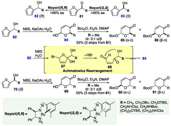 In practice, the process begins with achiral furyl ketone 81, which can be functionalized at the α-methyl position (C-6) with a variety of useful substituents. Then ketone 81 can then be reduced to the R- or S-chiral alcohol (78 or 79, respectively), with excellent enantioselectivity, via Noyori asymmetric hydrogenation using a chiral ruthenium catalyst [42,43,44,45]. Next, these alcohols are subjected to Achmatowicz rearrangement (via intermediates 87 and 88) to pyran alcohols 84 and 89, from furan alcohols 82 and 83, respectively, with the C-5 stereochemistry being set by the previous asymmetric reduction. Next, the equilibrating mixture of anomers is OH-protected, locking the pyranone into the α-configuration (85 and 90) or the β-configuration (86 or 91). The α/β ratio can be controlled by altering the protecting groups, or reaction conditions (Scheme 13). When the anomeric protecting group is an ester or carbonate group, it also serves as a Pd-π-allyl-leaving group for a Pd-catalyzed allylation reaction for coupling carbon, nitrogen, and oxygen nucleophiles [46,47,48].
