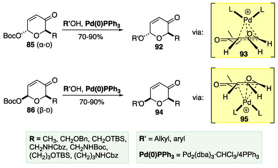 The next critical part of O’Doherty methodology is the utilization of a highly diastereoselective Pd-catalyzed Tsuji–Trost glycosylation (Scheme 14) [49,50,51,52]. This allows the anomeric position to be functionalized with a variety of different nucleophiles with complete stereochemical retention of the established C-1 stereochemistry. The diastereoselectivity of these transformations stems from the stereochemistry of the intermediate Pd complex. For example, α-pyranone 85 is converted into α-pyranone 92 via the β-intermediate 93 in 70–90% yield. The Pd catalyst coordinates to form the π-allyl on the opposite face of the C-1 leaving group. Therefore, when the alcohol attacks the π-allyl, it must approach from the opposite face as the Pd-group, which leads to the overall stereochemical retention. The same principle guides the transformation of β-86 to β-94 through the α-transition state 95 with a similarly strong yield. The route has been successfully applied to several oligosaccharide targets [53,54,55,56,57,58], with no or minimal use of protecting groups [59].