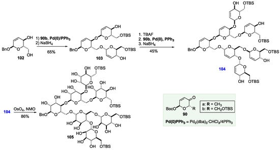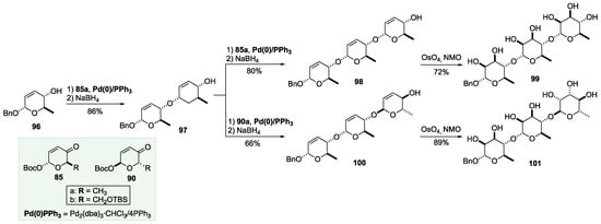 Where the Achmatowicz approach really distinguishes itself from the other de novo asymmetric approaches to carbohydrates is in its application to oligosaccharides, where the C-2/C-3 alkene can function as an atomless-protecting group (Scheme 15 and Scheme 16). By carrying the alkene functionality to the end of the oligosaccharide, these routes have excellent step economy when applied to both linear and branched oligosaccharides [60,61]. The route to the linear sugars started with allylic alcohol 96, which was prepared from ketone 85a in two steps (Scheme 15). A Pd-catalyzed glycosylation was accomplished using pyranone 85a, followed by a reduction to afford disaccharide precursor 97. By repeating this diastereoselective elongation of 97 (glycosylation/reduction) with two possible d/l-diastereomeric α-pyranones, trisaccharide precursors 98 and 199 were synthesized; 98 was synthesized by glycosylation and reduction using pyranone 85a, and 100 was synthesized through glycosylation and reduction using pyranone 90a. These two diastereomeric routes occurred with equivalent excellent overall efficiency and stereochemical control. A similar diastereoselective osmium-catalyzed dihydroxylation of the trienes 98 and 100 afforded trisaccharides 99 and 101, respectively (Scheme 15).