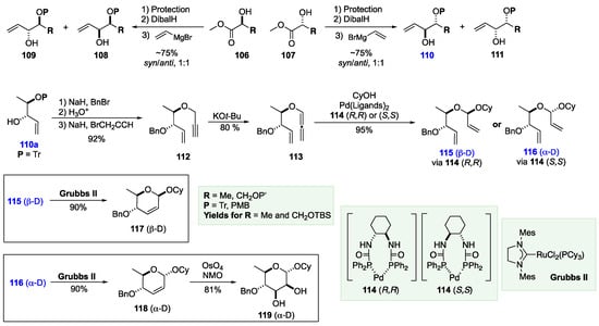 More recently, Rhee and co-workers developed an alternative de novo approach to hexose sugars [62,63], which is particularly compatible with oligosaccharide synthesis. Like the Achmatowicz approach, the Rhee approach relies on the use of a Pd-allylation reaction. This alternative approach builds upon the use of asymmetric Pd-allylation of alcohols with alkoxy-allenes that was developed by Trost and Lee [64,65]. In the Rhee application, the chiral ligands on the palladium catalyst (114(R,R) or 114(S,S)) are used to control the sugar acetal stereochemistry in the asymmetric allylation (113 to 115 or 116). After the allylation, a ring-closing metathesis (RCM) reaction is used to close the pyran ring (115 to 117 and 116 to 119 via 118). The approach is compatible with all the D-/L- and α-/β-sugar stereochemical combinations (Scheme 17).