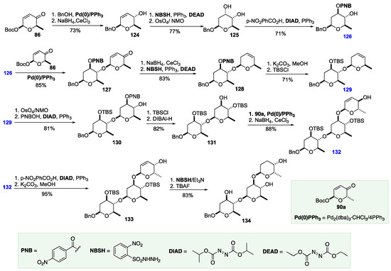 The application of the de novo Achmatowicz approach to the landomycins begins with β-pyranone 86, which can be prepared in three steps from commercially available 2-acetylfuran. Pyranone 86 was subjected to a palladium-catalyzed glycosylation with BnOH followed by a Luche reduction in the keto group to yield allylic alcohol 124. This alcohol was then subjected to a Myers’ reductive 1,3-allylic transposition followed by a stereoselective Upjohn dihydroxylation to afford diol 125 in 56% overall yield over four steps. Mitsunobu reaction conditions were then utilized to selectively invert the axial C-3 alcohol, converting 125 into a protected β-D-olivose 126 in 71% yield [85,86]. Next, 126 was used to glycosylate pyranone 86 using the typical palladium-catalyzed glycosylation conditions to form the C-4 glycosylated disaccharide 127 in 85% yield. A Luche reduction in the keto group in 127 yielded a diastereomeric mixture of allylic alcohols. However, when this mixture was exposed to the Myers’ reductive 1,3-allylic transposition conditions, the desired olefin 128 was produced in good yield. Next, the p-nitrobenzoate group of 128 was hydrolyzed and the resulting free alcohol protected with TBSCl to give silyl ether 129 in 71% yield. Following subjection of 129 to OsO4-catalyzed dihydroxylation, the resulting diol was applied to a regioselective Mitsunobu reaction to produce benzoate 130. The remaining free alcohol was then protected with a TBS group, after which the PNB-protected alcohol was liberated via DIBAL-H reduction to afford the desired glycosyl acceptor 131. Next, pyranone 90a was glycosylated with 131, producing allylic alcohol 132 after Luche reduction, providing an intermediate trisaccharide precursor. The allylic alcohol 132 was inverted using the Mitsunobu reaction followed by the removal of the resulting benzoate, affording axial alcohol 133 in 95% yield. Lastly, olefin 133 was reduced to provide the protected trisaccharide, which was liberated by TBAF-mediated protection with TBSCl to afford benzyl glycoside 134 in 83% yield over the final two steps (Scheme 19).