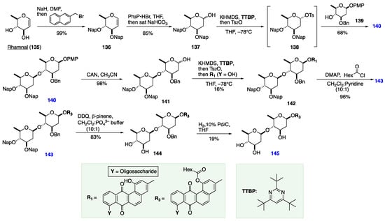 The Rhee groups’ synthesis of landomycin Y began with naphthyl-protection of rhamnal 135 to form 136 in nearly quantitative yield. Next, glycal 136 was converted to a 2-deoxy sugar 137, as an equilibrating mixture of unprotected anomers. Then, 137 was selectively converted to α-tosylate intermediate 138, followed by glycosylation with C-4 unprotected sugar 139 to afford protected disaccharide 140. Next, the anomeric PMP group was selectively removed via ceric ammonium nitrate (CAN) oxidation to afford acetal 141. Next, the aglycone component was coupled at the liberated anomeric position to afford 142 with the desired β-configuration, followed by protection of the phenol in the aglycone as n-hexyl ester 143. Then, 143 was sequentially deprotected—first by oxidative removal of the naphthyl groups with DDQ, followed by hydrogenation of the benzyl group, affording the first key coupling partner 145 (Scheme 20).