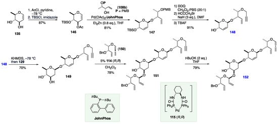 The synthesis of the second coupling partner also began with 135, which was iteratively protected as a C-3 acetate and C-4 TBS ether 146. Next, mono-protected diol 108b was coupled using Pd(II) chemistry to afford 147 with the desired β-linkage. Next, the PMB-group was removed, followed by propargyl addition to the resulting alcohol, and then TBS-deprotection yielding allylic alcohol 148. This alcohol was coupled with 135 to give the β-linked trisaccharide precursor 149. This was coupled with allene 150 using the appropriate chiral Pd catalyst to yield C-3 α-linked tetra saccharide precursor 151. Finally, terminal alkyne 151 was isomerized to allene 152 under standard isomerization conditions (Scheme 21).