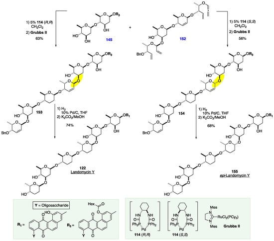 Allene 152 and alcohol 145 were coupled together with both the (R,R) and (S,S) Pd catalysts to install the α- or β-linkage, respectively. This was followed by ring-closing metathesis using the Grubbs catalyst to cyclize the terminal sugar residue, giving hexasaccharide precursors 153 and 154, respectively. Finally, the benzyl groups were removed by hydrogenation, and the n-hexyl esters of the aglycones were subjected to base hydrolysis to afford landomycin Y 122 in two steps from 153, and epi-landomycin Y 155 from 154. The use of 114(R,R) versus 114(S,S) to produce either 122 or 155 demonstrates the stereochemical versatility of this reagent-controlled approach to anomeric stereochemical control (Scheme 22).