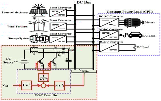 Microgrid architectures are generally categorized into three categories: AC, DC, and hybrid. Among these, DC microgrids are gaining prominence due to their distinct advantages over AC microgrids. DC microgrids eliminate the necessity for synchronization, avoid frequency-related issues and harmonics, and reduce reactive power losses. They also offer higher efficiency, better compatibility with renewable energy sources and energy storage systems, and the ability to directly power DC loads, which are increasingly common in modern applications. These features make DC microgrids a highly attractive option for modern energy networks [5,6]. A critical component of DC microgrids is the DC/DC converter, which plays a pivotal role in interfacing renewable energy sources, energy storage systems, and loads. However, despite their numerous benefits, DC microgrids face significant stability challenges, primarily due to the presence of constant power loads (CPLs) [7,8]. CPLs are nonlinear loads with incremental negative impedance (INI), meaning they draw less current when voltage rises and more current when voltage drops. This counterintuitive behavior can destabilize the system by reducing its ability to absorb disturbances, leading to oscillations. Common examples of CPLs include power electronic converters, LED drivers, welding machines, and battery chargers, all of which require precise regulation to ensure stable operation [9].