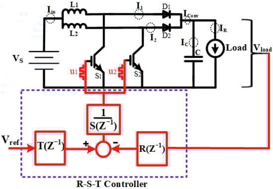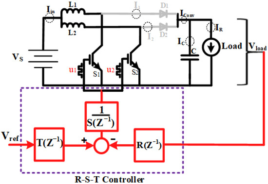 IBCs have gained popularity in DC microgrids due to their ability to reduce input current ripple, improve efficiency, and handle higher power levels. The interleaving technique involves operating multiple converter phases in parallel with phase-shifted switching signals, which reduces the overall current ripple and distributes the thermal stress across multiple components. Several control strategies have been proposed for IBCs, including current-sharing control, voltage regulation, and disturbance rejection techniques [20,21]. However, the presence of CPLs in DC microgrids introduces additional challenges, such as uneven current distribution among phases and instability during dynamic load changes. Existing control strategies often fail to address these issues effectively, particularly in scenarios where the number of active phases varies due to load conditions or fault events [22]. RST controllers, which are based on polynomial control theory, have been explored for their ability to provide robust and flexible control solutions for power electronic systems. RST controllers use a combination of reference tracking (R), state feedback (S), and disturbance rejection (T) to achieve desired performance. In [23], an RST controller was proposed for a DC/DC buck converter, demonstrating improved voltage regulation and robustness against load variations. However, the application of RST controllers in IBCs with CPLs has not been extensively studied. The combination of RST control with IBCs could offer significant advantages, such as enhanced stability, improved dynamic response, and better disturbance rejection, particularly in the presence of CPLs. Despite the advancements in control strategies for DC/DC converters, several challenges remain unaddressed, particularly in the context of IBCs operating in DC microgrids with CPLs. Existing control methods, such as PI, SMC, MPC, and ADRC, often fail to provide robust performance under varying operating conditions, such as changes in the number of active phases or dynamic load variations. Additionally, the integration of RST controllers with IBCs has not been thoroughly explored, leaving a significant gap in the literature. A comparative summary of the main control methods is presented in Table 1.