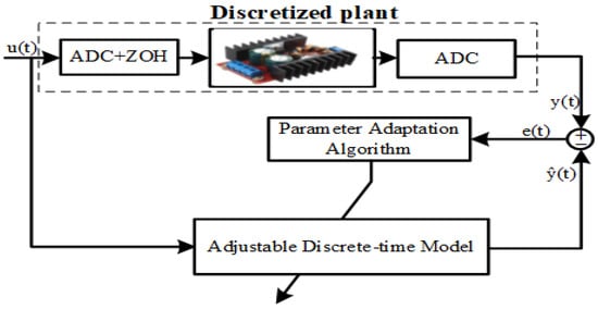 The RST control methodology is a computational technique that depends on the dynamic characteristics of a system, represented through a mathematical model. Accurately formulating this model is a crucial challenge, as the effectiveness of the control system is directly influenced by its precision. By utilizing MATLAB 2024b’s identification toolbox, a discrete-time model with adaptable parameters is constructed, as illustrated in Figure 7. A parameter adaptation approach is implemented to minimize the prediction error, which is defined as the difference between the actual system output and the estimated output . from the model. To enhance accuracy, these parameters are updated at each sampling instance. The system is stimulated by a discrete input sequence for t = 0, 1, 2, …, n, which is subsequently converted into a continuous signal using a Zero-Order Hold (ZOH) [25].
