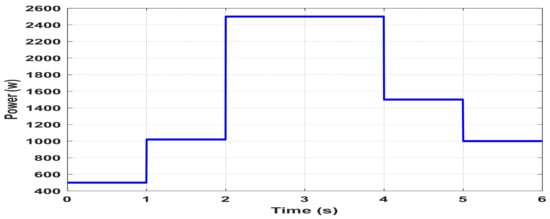 Figure 9, Figure 10 and Figure 11 demonstrate the effectiveness of the proposed control strategy in regulating the DC bus voltage and ensuring accurate current sharing among the converters under dynamic CPL conditions. As depicted in Figure 9, the CPL power demand is varied in steps: it initially increases from 500 W to 1000 W at t = 1 s, followed by a rise to 2500 W at t = 2 s. Subsequently, the load decreases to 1500 W and finally to 1000 W in two discrete steps. Figure 10 illustrates the dynamic performance of the DC bus voltage in response to abrupt changes in the CPL. The blue solid line represents the measured DC bus voltage, while the red dashed line denotes the voltage reference. Each load disturbance introduces a brief deviation in DC bus voltage, as highlighted in the magnified insets for each event. Despite these transients, the system quickly recovers and re-aligns with the reference voltage, demonstrating strong voltage regulation and dynamic robustness. The limited overshoot and fast settling time following each disturbance indicate the effectiveness of the proposed control strategy in maintaining voltage stability under varying load conditions.
