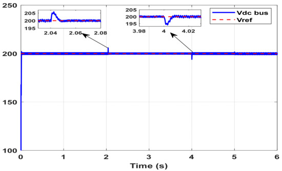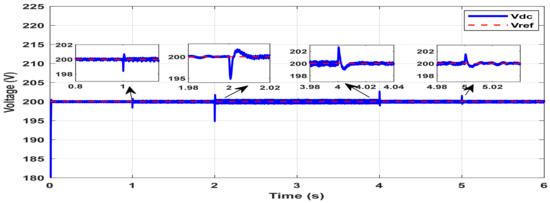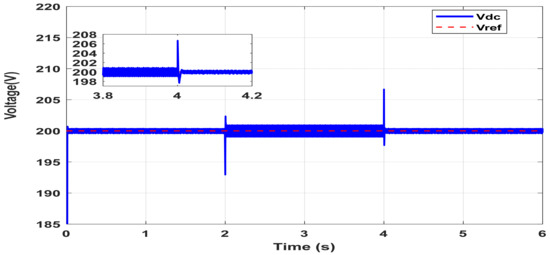 Figure 16 illustrates the dynamic performance of a high-performance closed-loop control system tasked with regulating the DC bus voltage to a constant reference value of 200 V. The system demonstrates exceptional steady-state regulation, maintaining the voltage with negligible deviation throughout normal operating conditions. However, the controller’s robustness is most evident during its response to significant input-side disturbances occurring at t = 2 s and t = 4 s. As shown in the first magnified inset, a voltage overshoot is observed at t = 2 s, with DC bus voltage peaking at approximately 204 V, corresponding to a +2% deviation from the reference. The controller swiftly mitigates this disturbance, restoring the voltage to its nominal value within approximately 40 milliseconds—indicating a fast settling time and effective damping characteristics. At t = 4 s, the system encounters a second disturbance, resulting in a brief undershoot where the DC bus voltage dips to around 196 V (a −2% deviation). This event is followed by an even faster recovery, as captured in the second inset. The prompt correction of both overvoltage and undervoltage transients underscores the high level of dynamic responsiveness provided by the control scheme.